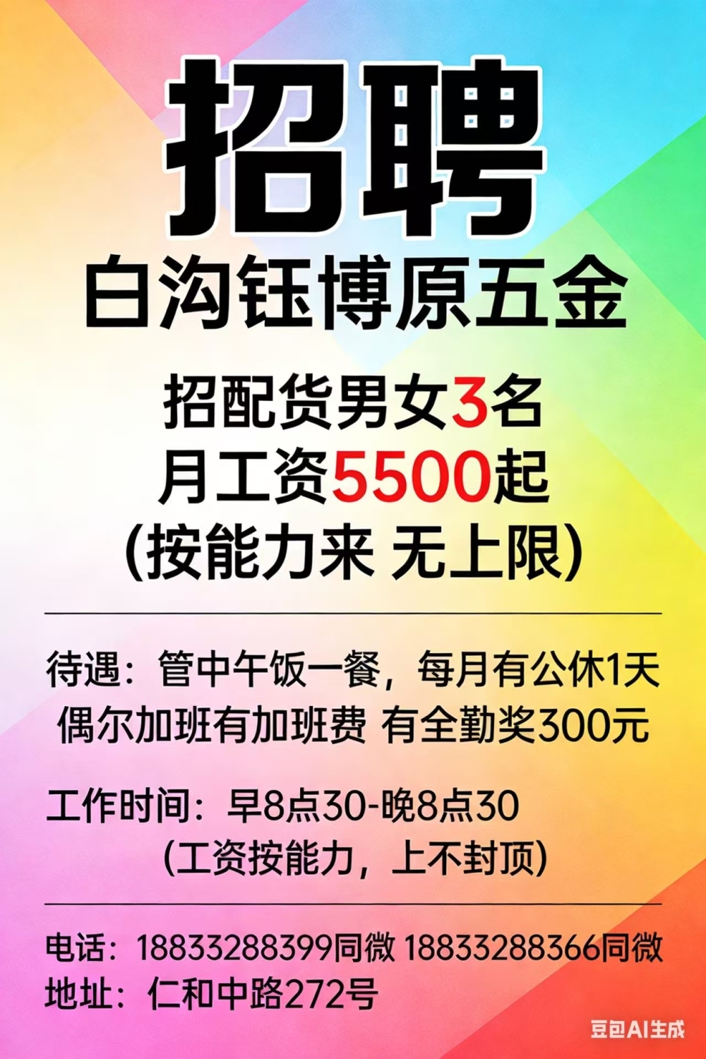 塑料袋批发库房(白沟)招聘一、招聘岗位:男工配货送货 二、薪资待遇:工...
