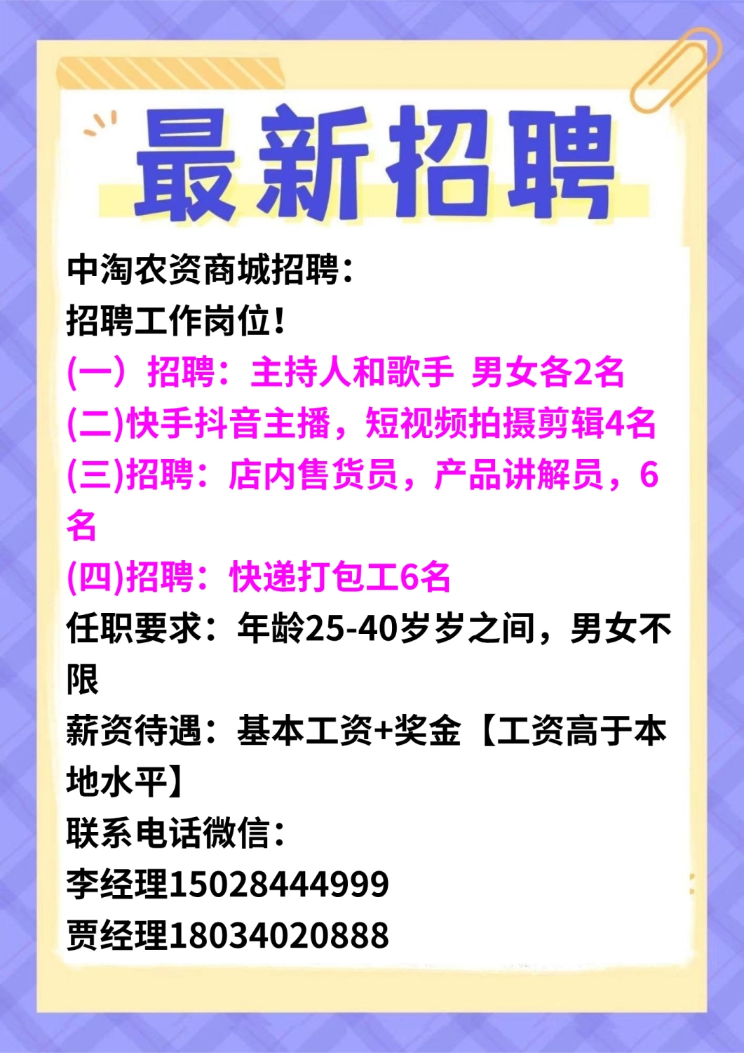 招聘:2名助理和1名人事岗要求:...