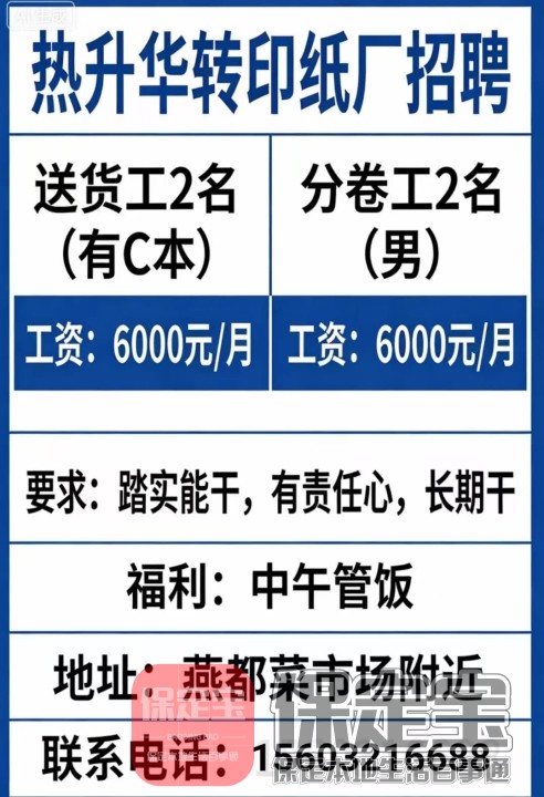 热升华转印纸厂招送货工2名(有C本)分卷工2名(男)工资6000要求踏实能干...