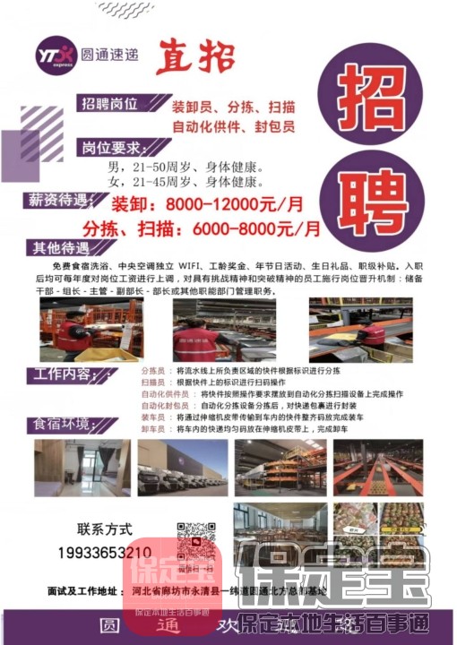 圆通速递华北转运中心大量招人,...