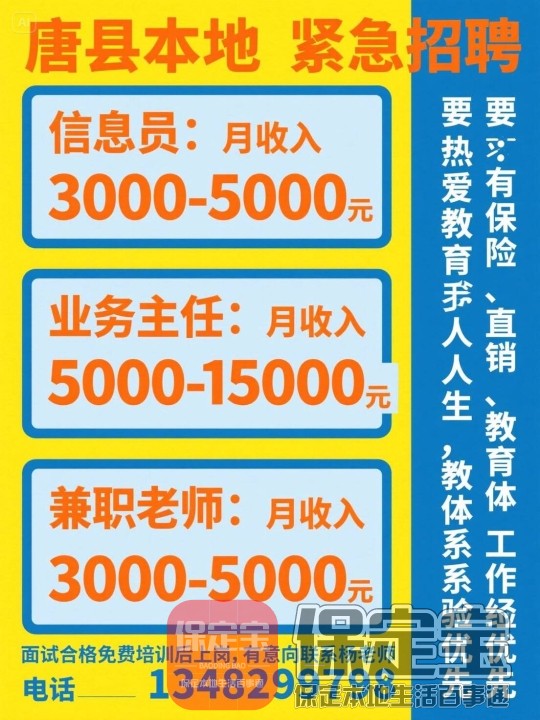 诚招乡镇招生主任5名,年龄35~55岁,4000元~9000元以上,会开车优先;如果学生家长面试想做兼职的,还有免费家庭教育课,每周一次免费家庭教育课