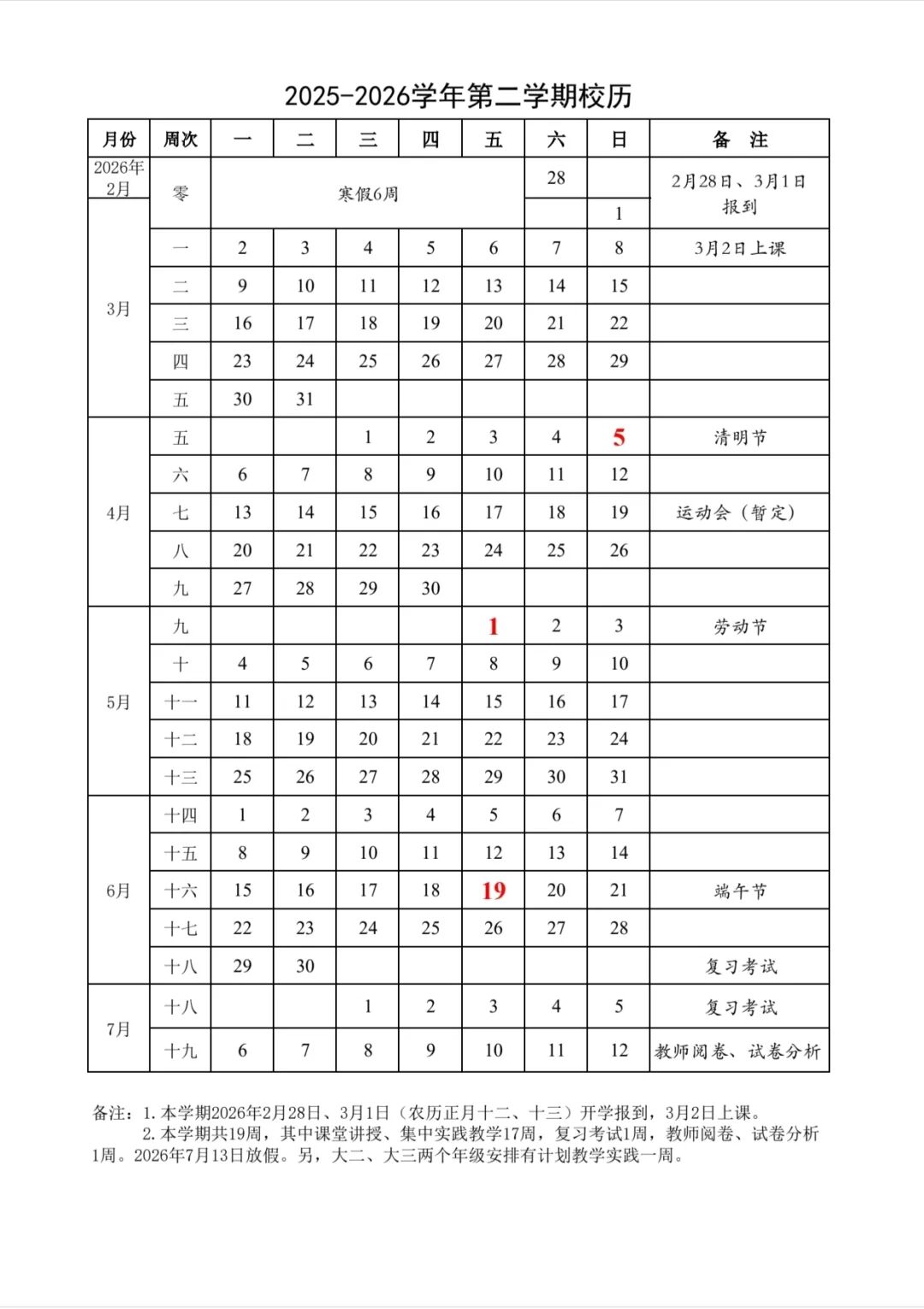 2026年2月28日、3月1日(农历正月十二、十三)开学报到,3月2日上课。